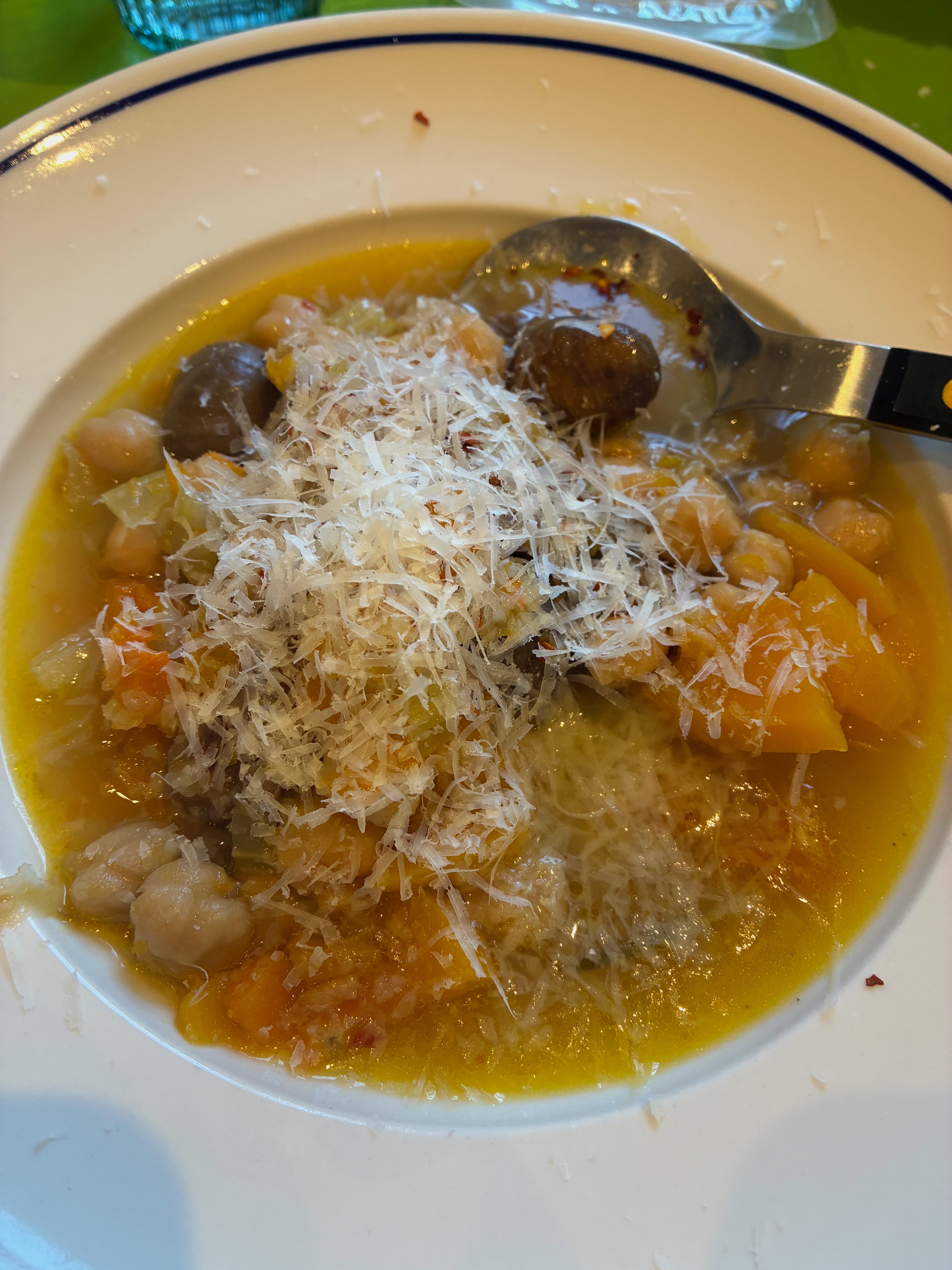 Here is the version of the soup I have been making repeatedly this winter using fancy pre-cooked chickpeas and vac pack chestnuts. For the one I made in Rome I soaked and cooked the chickpeas – but I am currently working, writing my next book, and am 8 months pregnant, so do not have the capacity for a more longwinded version.