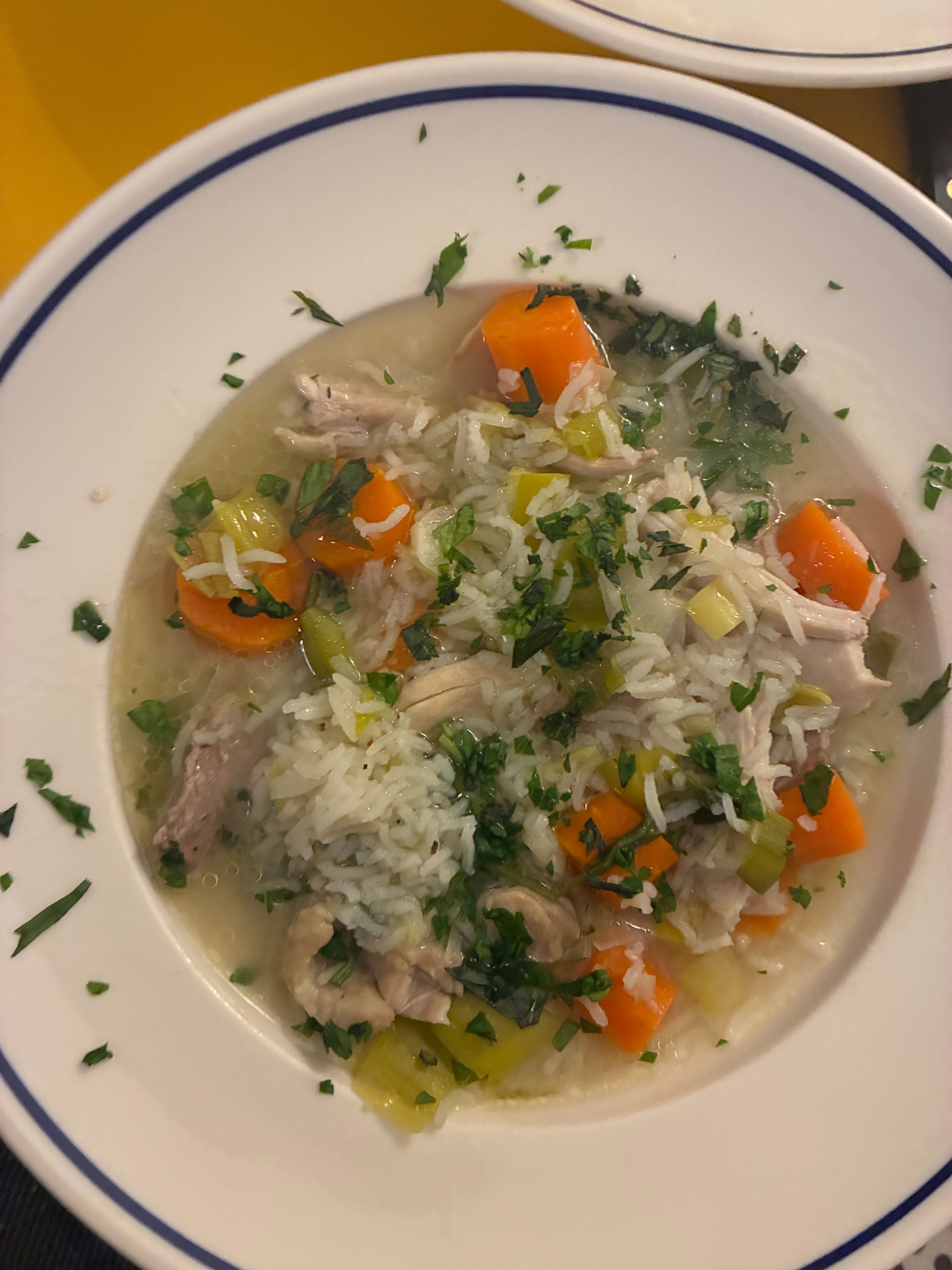 Place everything apart from the rice and parsley leaves in a heavy saucepan and just cover with water so it’s about 2cm above the contents of the pan. Simmer gently for 25ish minutes or until the chicken is cooked through, then add the rice and simmer gently for 10-15 minutes until the rice is cooked. If you need more water for cooking the rice, add some – cautiously though, as you don’t want to over-dilute the broth.