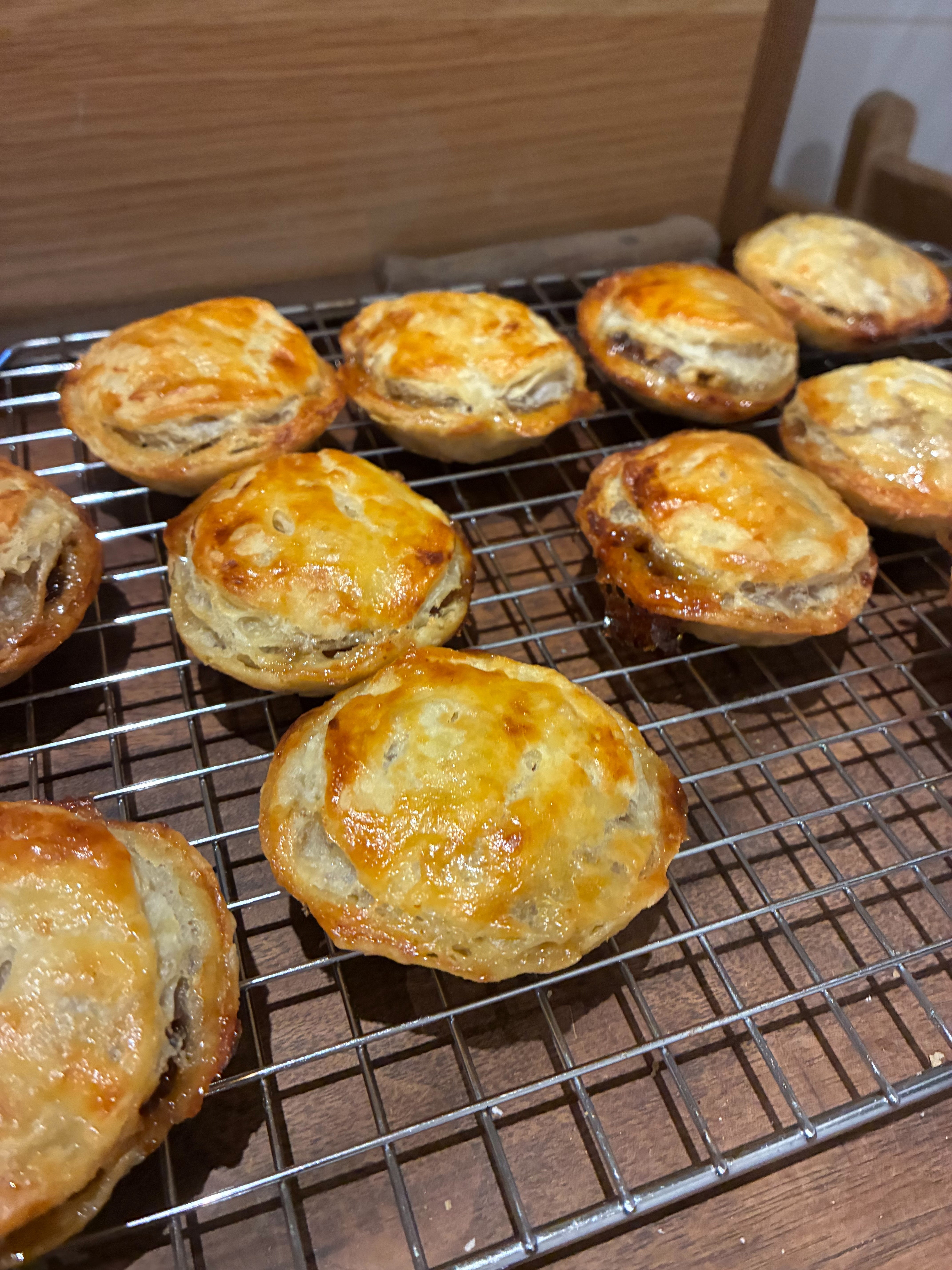 I made Delia Smith’s quick flaky pastry (from her indispensable Complete Cookery Course) and used it to make mince pies to take to a chaotic and wonderful children’s Christmas service at a nearby village church – as well as some sausage rolls. I did not make the mincemeat myself (I hope to do so some time – my mother always does) but mixed in chopped almonds, lemon zest, a little chopped candied peel and a dash of brandy to a supermarket jar. The butter I used for the pastry was totally frozen and I grated it as per Delia’s method and it produced the most wonderful puffy, flaky pies and the filling tasted very good too. One person declared them the best mince pies they’d had! Sausage rolls were a critical source of food for various children at the church service, too – and I brought a bottle of ketchup with me for application in situ.