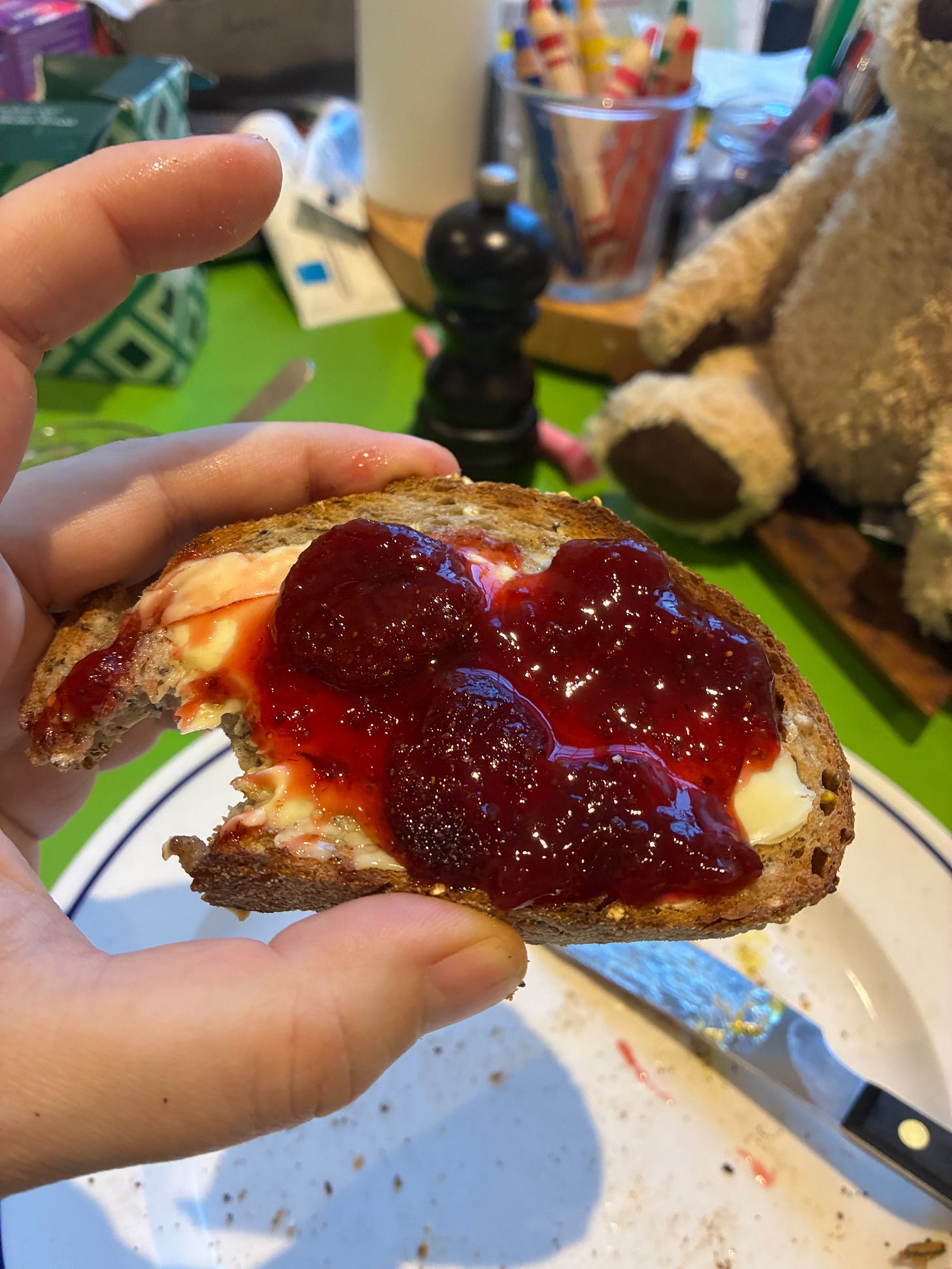 I’ve been emptying the freezer of soft fruits bought in the summer and making jam: raspberry, strawberry so far, and blackcurrant this afternoon. Gooseberry next. I am having a baby, probably next week – and my mother has kindly offered to make some meals to freeze for when we are too chaotic and sleep deprived to cook, and so I had to make space. I love the Chez Panisse Fruit Book, and applied their method for the raspberry jam to the strawberries and was very pleased. I left them to defrost overnight with the sugar, so the sugar had dissolved prior to cooking.