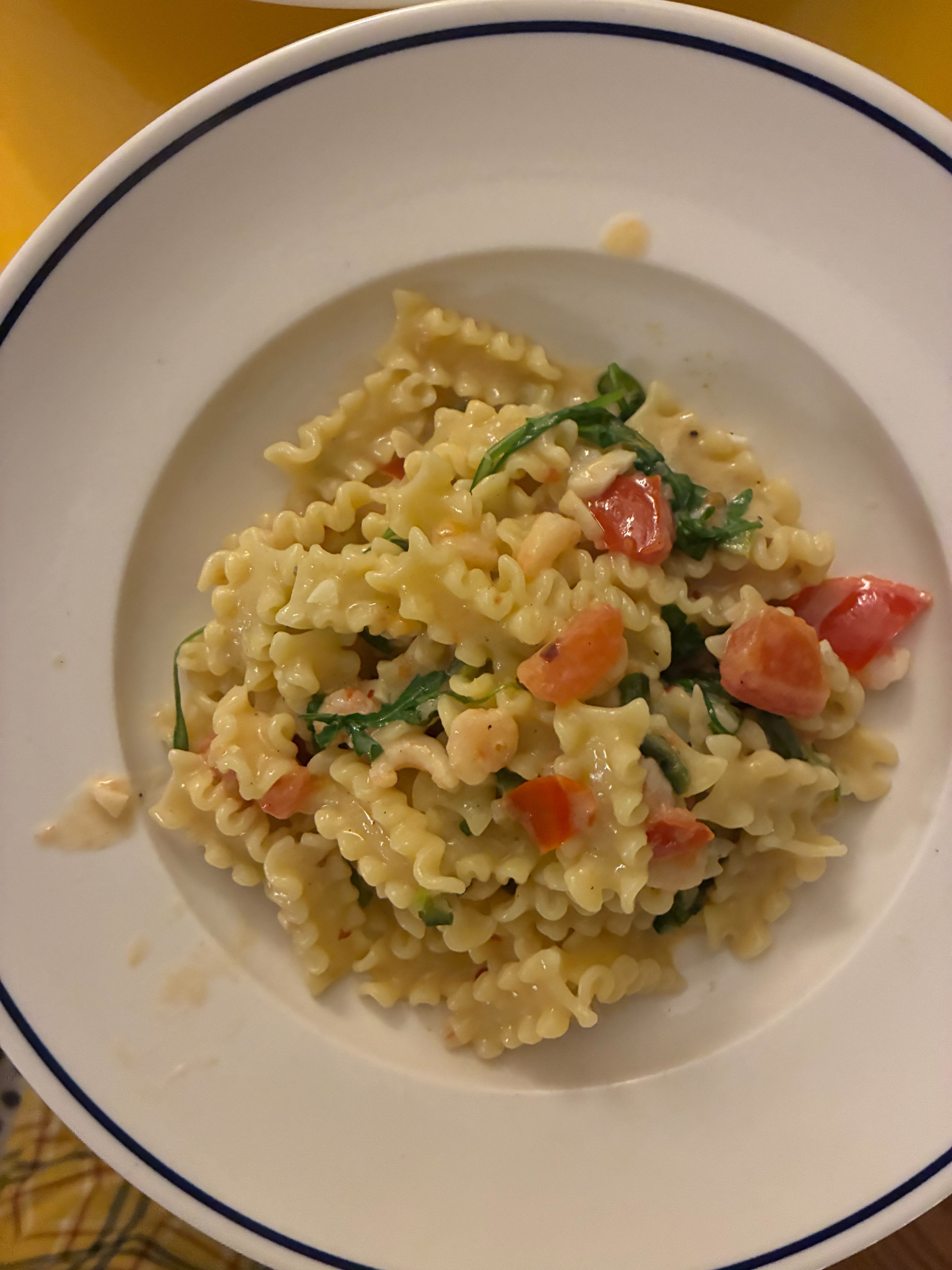 Inspired by my mother, who told me about an omelette she’d made for herself with the addition of frozen prawns while my father was away recently, I bought a bag. They have since been a source of several unexpectedly sumptuous-tasting meals when the fridge looked fairly empty. This pasta using the prawns and various odds and ends was very good. Sam also made us an excellent pasta with the prawns, dill, cream and lemon.
