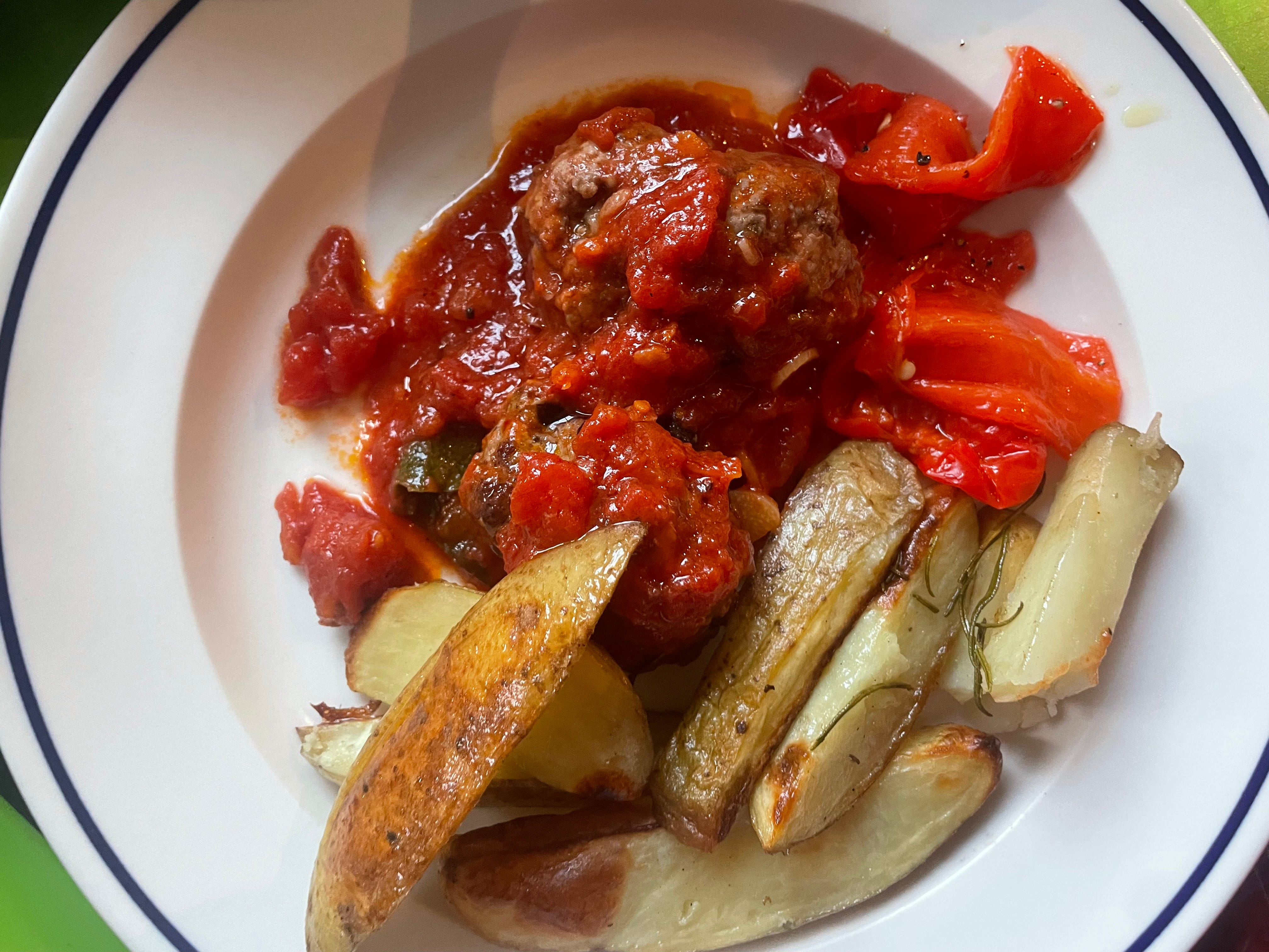 Lamb meatballs with currants in tomato sauce, with roasted peppers and skin-on wedges