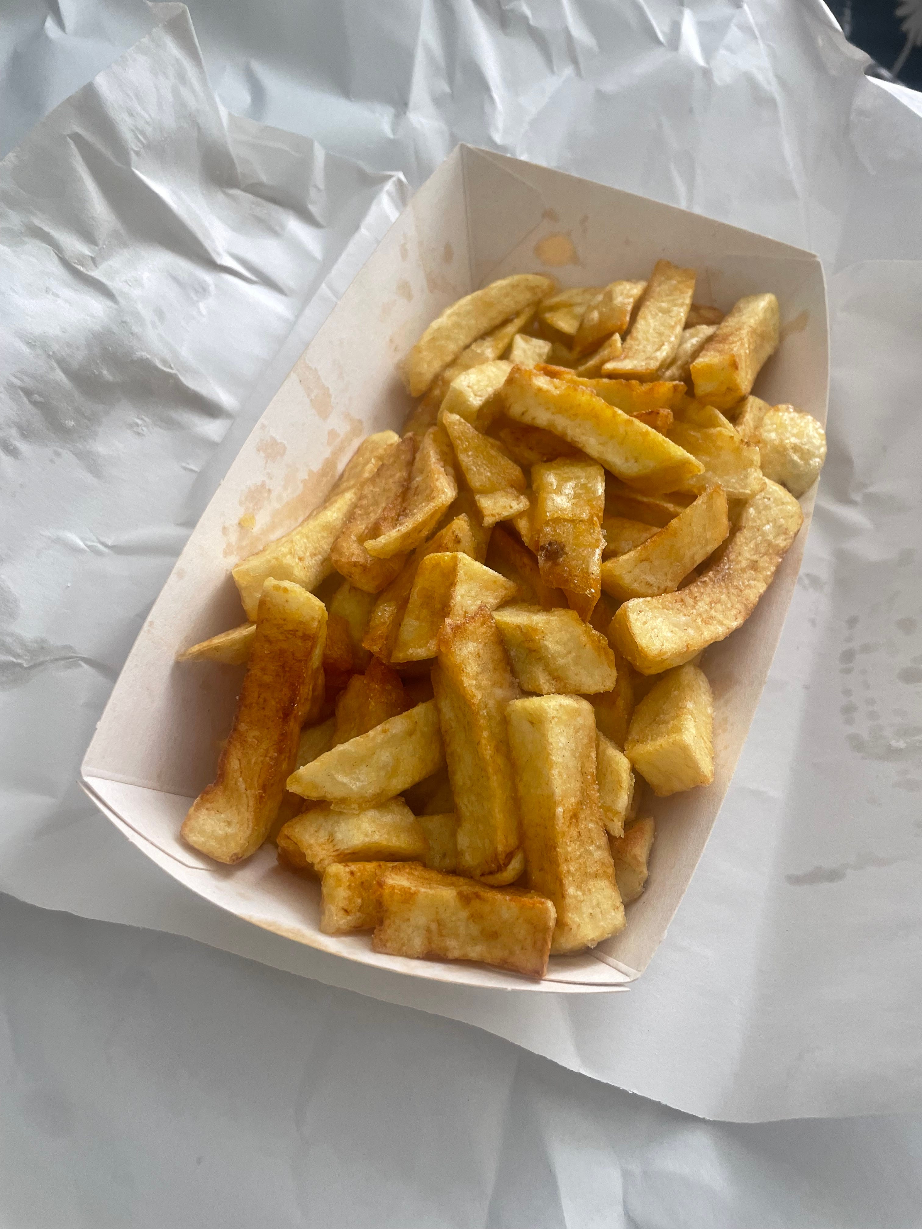 A container of chips from my local chipshop, Pieseas, who cook in beef dripping. One of my favourite foods.