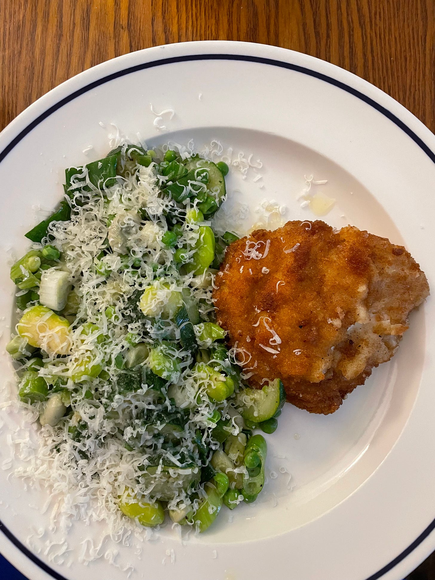 Last Friday I boiled a small courgette that had been halved lengthways then sliced half a cm thick, a few handfuls of broad beans, and a few handfuls of peas in salted water until tender. Then I tossed them with three spring onions that had been sliced then softened in butter and olive oil. I stirred through a tablespoon of parsley and served with grated parmesan, a drizzle of olive oil, salt and pepper. We ate it with a chicken Kyiv. S was in raptures about the vegetables.