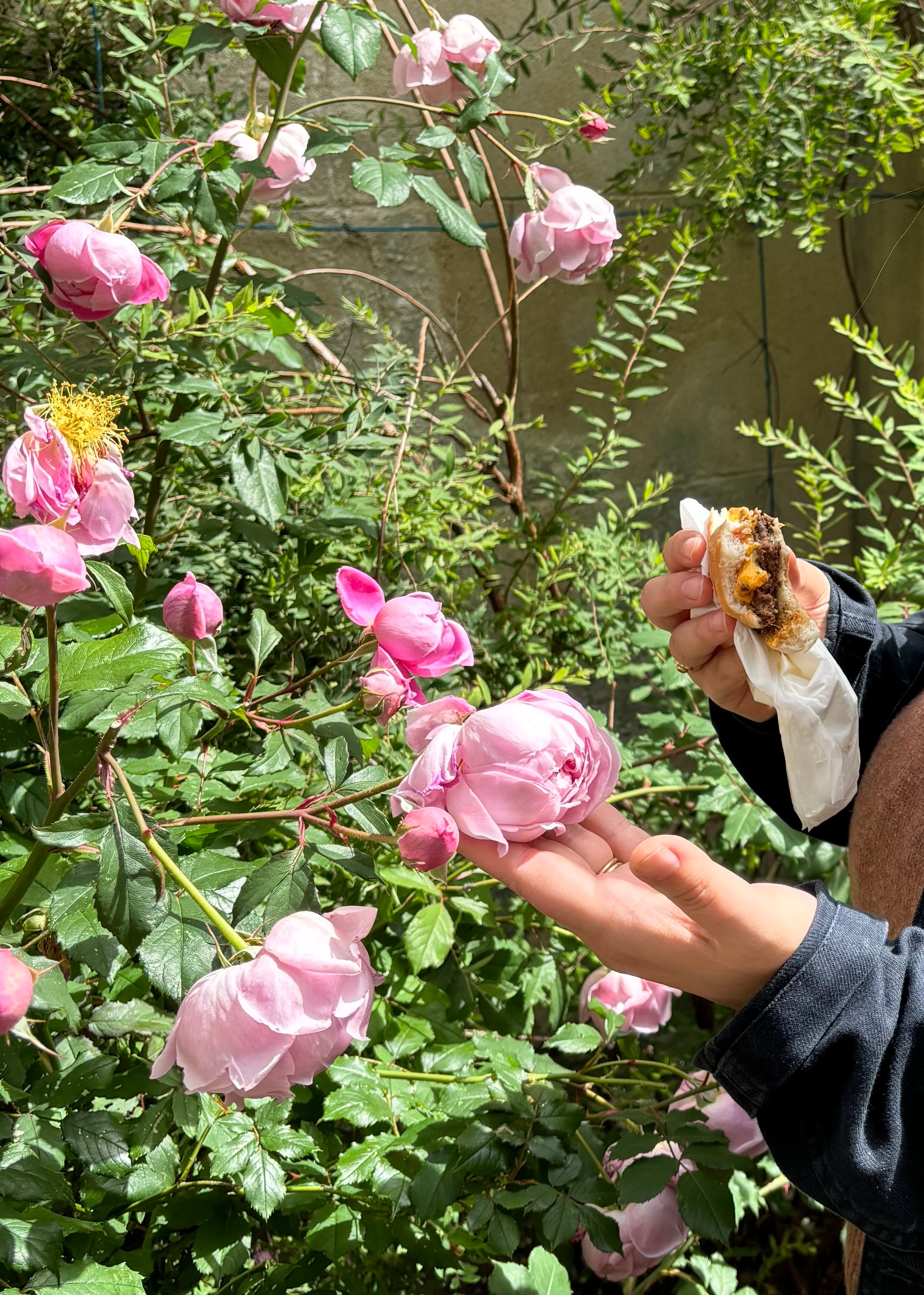 We headed to the first garden listed in the leaflet and I continued eating. We walked round the back of an apartment building following the signage and descended into a sunken garden that I had not known was there. My dad’s friend lived in this building until last year, when he died. I wondered if he came to this garden – he liked beautiful things. I ate my burger and smelled the pale pink roses, highly scented, heads dipped.