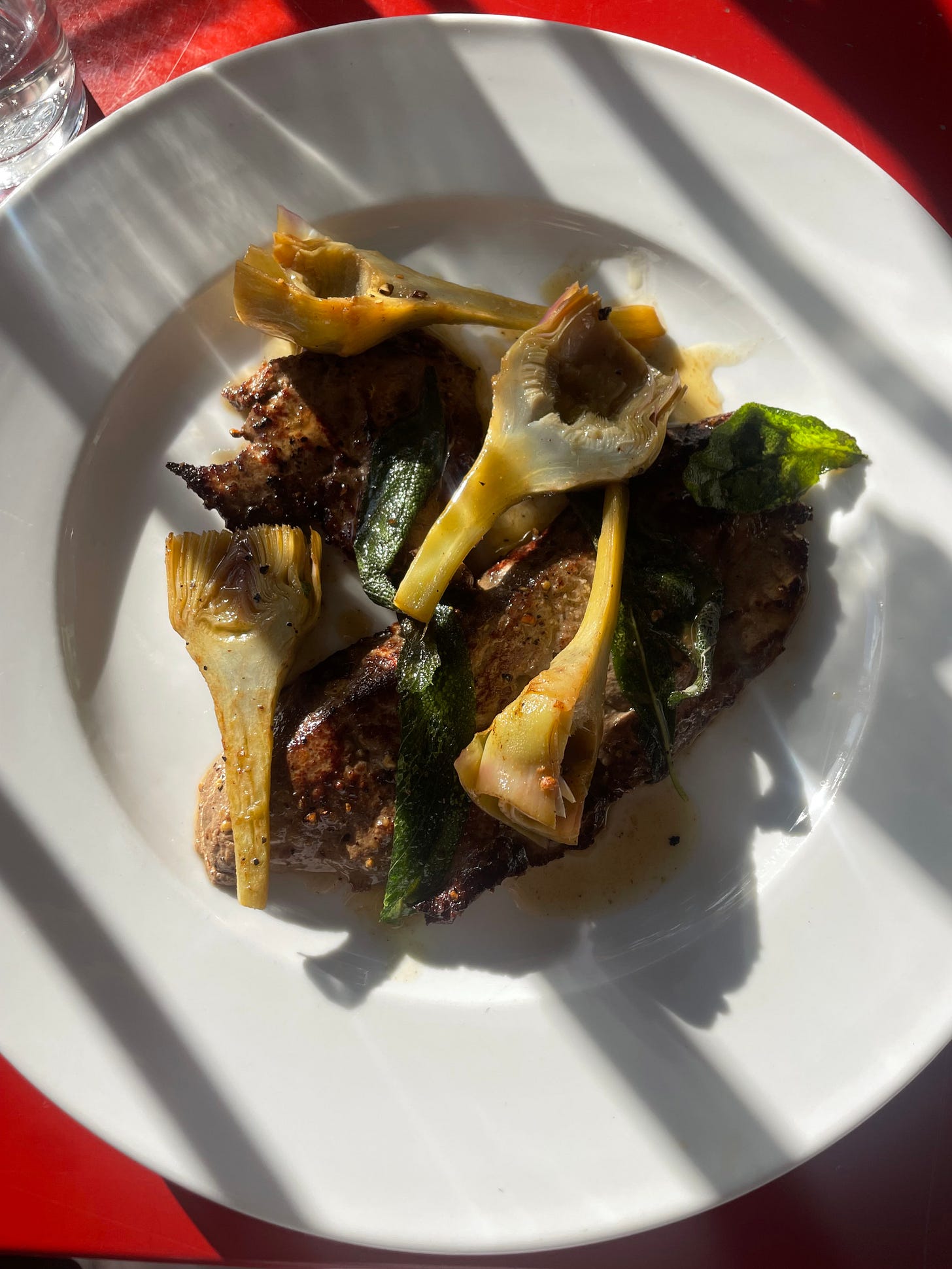 I went to see the writer Constance Debré speak at the London Review of Books a few weeks ago. Her book Love Me Tender was one of my favourites of 2023. I realised there was a 45 minute window when I could eat before the event (I would have to dash off afterwards to make the train back to Essex). It was barely 6pm so I thought I would chance Cafe Deco in Bloomsbury where I have eaten twice before and only once on my own dime. I had some pecorino and broad beans with a piece of bread, then a plate of artichokes with calves liver and fried sage, with a glass of chilled and slightly fizzy red wine. The next table began talking to me and suggested I offer my broad bean husks to their dog, which I did. He expressed interest but did not partake. Then I ran, actually ran, to the book event and arrived very sweaty, but it was worth it.