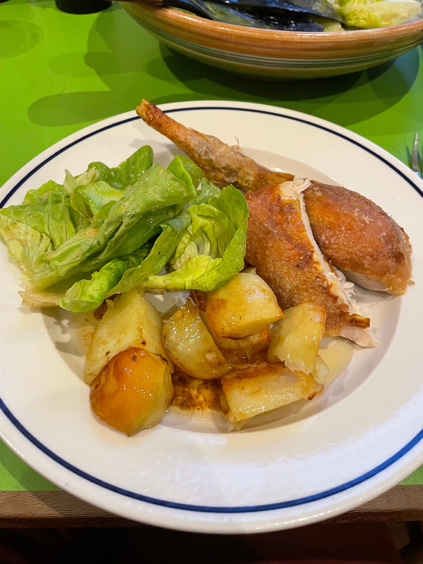 I have realised that mostly, I just want a roast chicken to taste of chicken. When I make it I do not want it to be roasted with garlic or lemon or herbs which adulterate the chicken flavour and often burn. Cooked in this way it has (so far) never failed to be moist and delicious. We ate it with the potatoes which were half-squidgy with chicken juices and half crispy on top, cooking juices spooned over, and green salad of round lettuce with a dressing made from Dijon mustard, olive oil, red wine vinegar, salt and pepper. I first had salad and chicken together in this way – chicken juices and sharp dressing intermingling – in the early 2000s when the idea was suggested to my mother in one of Nigel Slater’s books. It quickly became established.